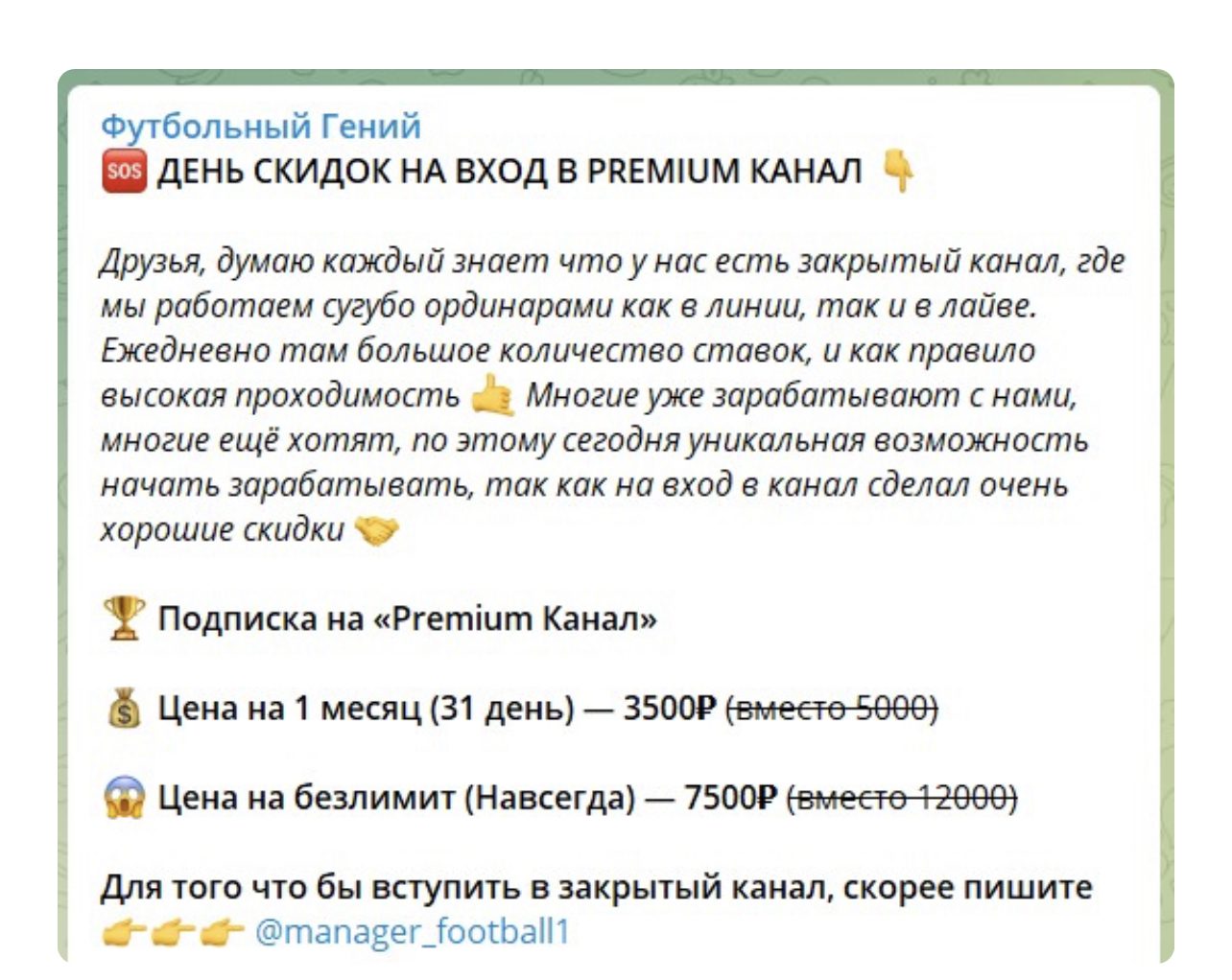 Наши аналитики проверили Telegram проект Футбольный гений, владельцы которого продают инсайдерскую информацию о спорте. В ходе проверки мы обнаружили, что канал промышляет серыми схемами. Обо всем далее подробнее.