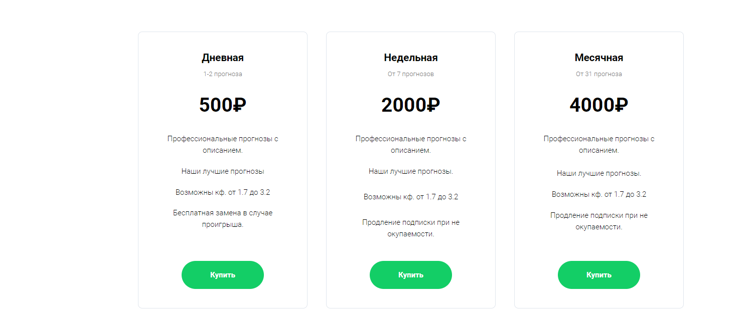 Недельная – от 7 прогнозов с описанием, коэффициенты от 1.70 до 3.20, в случае неполучения прибыльности, подписка автоматически продлевается еще на неделю. Цена – 2 тысячи российских рублей.