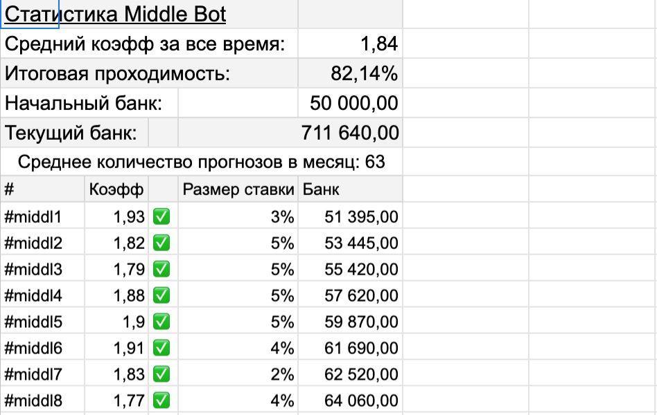 • Middle Bot – улучшенный вариант рассылки, где коэффициенты прогнозов возросли до 1.80+, а проходимость составляет уже 82%.
