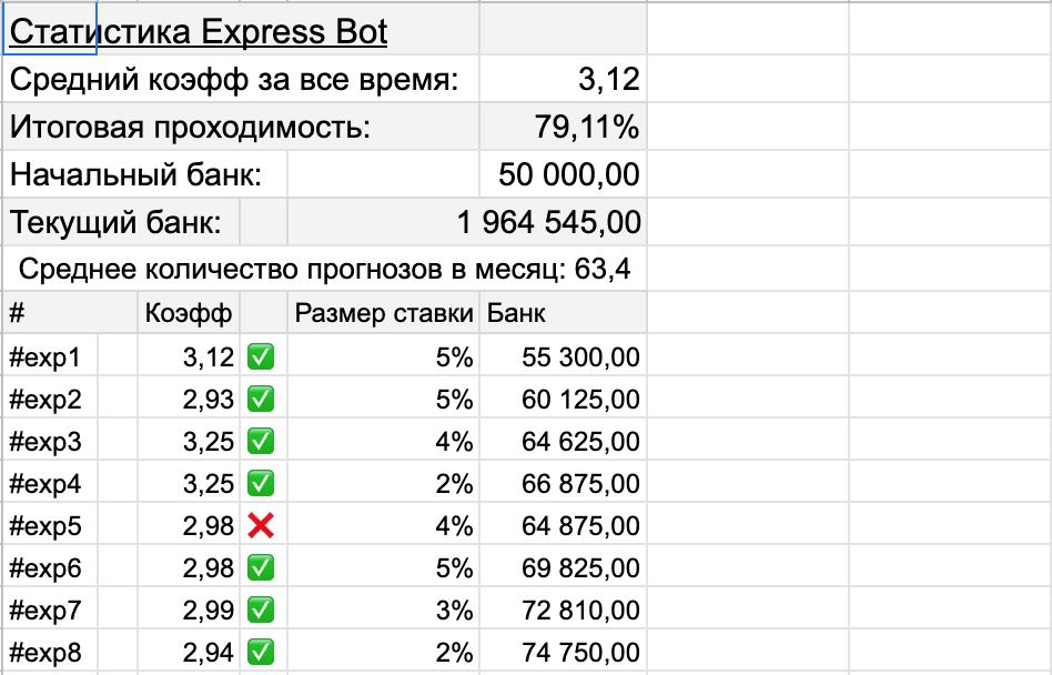 • Express Bot – как ясно из названия, подразумеваются комбинированные прогнозы с общим множителем до 3.10. Заявлена 78% проходимость экспрессов, что, вероятно, больно обнадеживающий показатель. Но даже при 50% результативности такие ставки себя полностью окупают на дистанции.