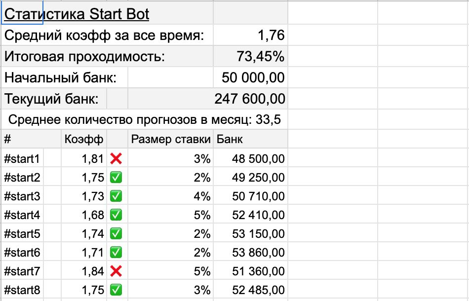 • Start Bot – базовый пакет, где стоимость ежемесячной подписки составляет 5 000 рублей, а при оформлении доступа на год можно неплохо сэкономить, ведь в этом случае нужно заплатить всего 20 000 рублей. Ставки идут с коэффициентами от 1.70+ с проходимостью 73% и выше.