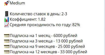 По Medium подписке вы уже будете получать от двух до трех ставок в день с увеличенной проходимостью и коэффициентом (82% и 1,82). Цена при этом растет крайне незначительно: 6000, 13 000, 25 000 и 33 000 рублей. Создается впечатление, что начальный пакет прогнозов был создан исключительно в качестве рекламы более дорогих вариантов. Уже при беглом сравнении разница становится очевидной.