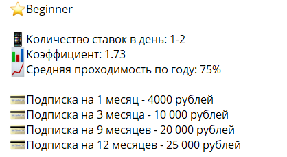 Beginner подписка включает в себя 1-2 прогноза ежедневно. Проходимость у них колеблется в районе 75% при коэффициенте в 1,73. Довольно неплохой показатель, но не самый лучший на рынке. Цена пакета следующая: 4000, 10 000, 20 000 и 25 000 рублей. В сравнении с конкурентами – выгодно, если сравнивать с другими предложениями этого каппера, то вряд ли заслуживает внимания.