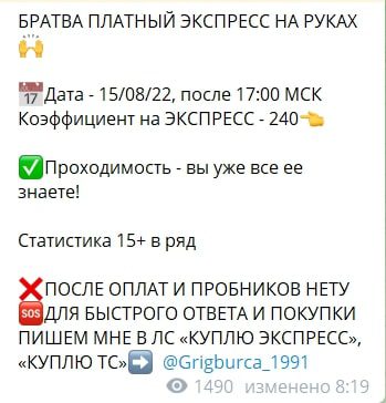ВИП канал каппер рекламирует особенно активно. Не успели мы подписаться на канал, как уже получили сообщение от Григория с рекламой его ВИП канала и с предложением начать сотрудничество. Подписка на месяц стоит 3 тысячи рублей, заметим, что раньше цена была 5 тысяч.