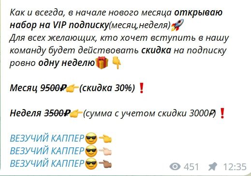 Подписку на VIP чат Vezuchiy Kapper предлагает в начале месяца, подписаться можно как на месяц, так и на 2 недели, стоимость в первом случае 9500, а во втором 3500 рублей.