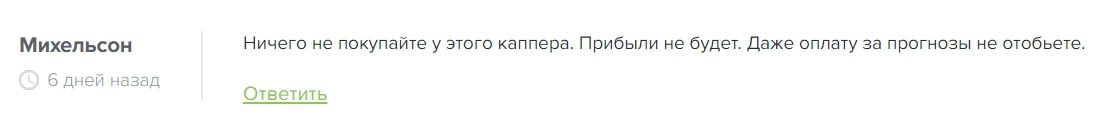 Мы считаем, что услугами Vezuchiy Kapper лучше не пользоваться, доходность его проекта ничем не доказана. Реклама букмекера вызывает большое сомнение в качестве предлагаемых прогнозов, статистика ведется только своя, а по бесплатным прогнозам показатели на дистанции отсутствуют вообще. Мнение пользователей Телеграмм канала ПРОХОККЕЙФУТБОЛ не в пользу каппера.
