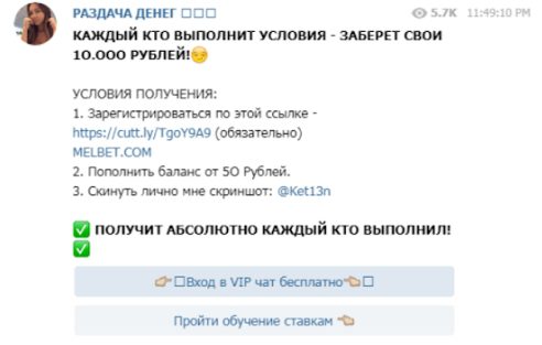 - под предлогом заработка подписчики заманиваются на страницу небезызвестной букмекерской конторы МЕЛБЕТ;