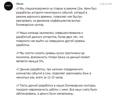 Разработчики Shein создали собственный софт, который в режиме реального времени анализирует изменения коэффициентов на те или иные исходы, что позволяет с большей долей вероятности обыгрывать букмекеров, получая при этом максимум прибыли.